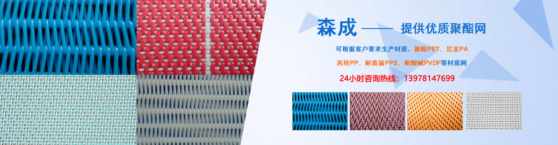 同時主導產品還有:聚酯成型網,聚酯平織干網、聚酯螺旋干網、聚酯銅絲抗靜電網,主要用于造紙、環(huán)保、印染、洗煤、石油化工、制藥、食品烘干、人造板廠、冶金、電廠脫硫、礦業(yè)、發(fā)酵等行業(yè)。公司產品具有耐酸堿、耐高溫、濾水好、透氣好、尺寸運行穩(wěn)定的特點,憑質優(yōu)價廉及優(yōu)良的售前、售后服務暢銷國內還可以根據用戶要求生產各種規(guī)格型號的特殊用網,其長度、寬度、密度可根據用戶要求臨時確定,產品質量上乘,在廣大客戶中享有很高的聲譽。